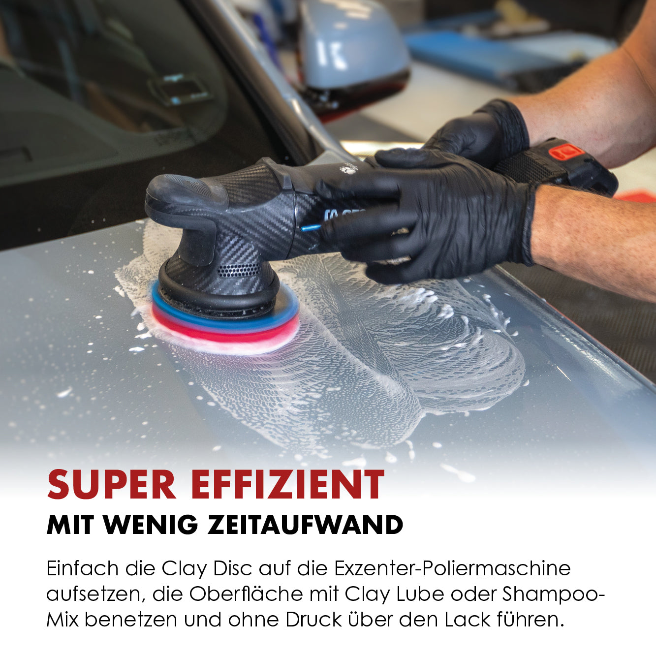 Simply attach the Clay Disc to your orbital polisher , wet the surface with Clay Lube or a shampoo-water mix , and glide it over the paint without applying pressure . The disc removes residue quickly and evenly – for a flawlessly smooth surface and ideal polishing preparation.