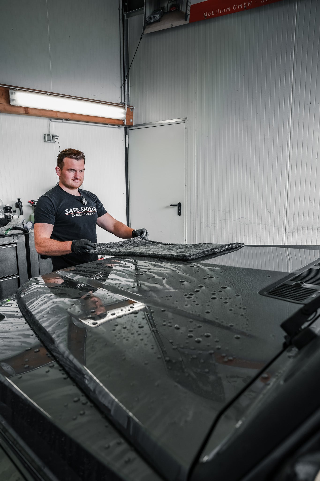 Ein hochwertiges Trockentuch entscheidet über das Endergebnis nach der Fahrzeugwäsche.