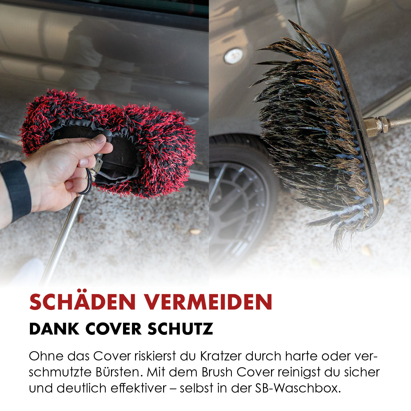 Brush Cover är speciellt utvecklat för användning på självservice-tvättstationer. Det skyddar effektivt mot aggressiva borstar och ger samtidigt en effektiv rengöring – utan kompromisser på skum eller vattenflöde.